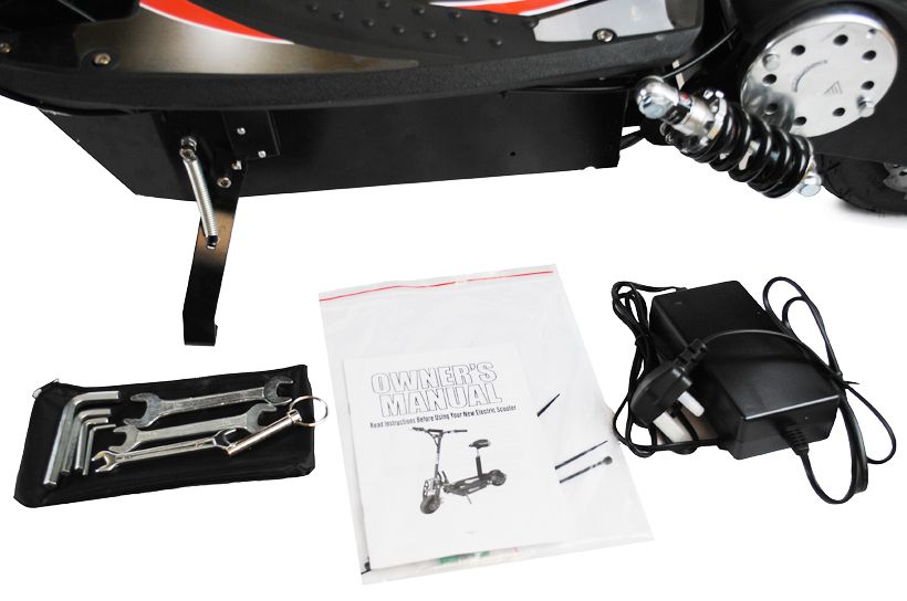 Specification Detail Engine / Motor Size 800W Electric Motor Deck Material ABS Fuel Type Electric Maximum Range 33 KM (dependent on weight and surface) Battery 12Ah / 36V (12V x 3pcs) Charge Time 12-16 Hours Maximum Speed 25 KM/h (dependent on weight and terrain) Front Brakes Vented Disc Rear Brakes Vented Disc Front Suspension Single Coil with height adjustment Rear Suspension Twin Coils with height adjustment Front Tyres 10" Pneumatic Rear Tyres 10" Pneumatic Starting System Ignition Key Transmission Direct Drive Automatic Wheel Base 95cm Seat Height Adjustable, Removable Ground Clearance 10cm – Adjustable Net Weight 40 Kg Drive Train Chain Driven Recommended Age 14+ Packing Info Minor Assembly Required. Free Tools Included Extra Info Single lever folding/locking mechanism for transport/storage. Includes mains charger and tool kit
