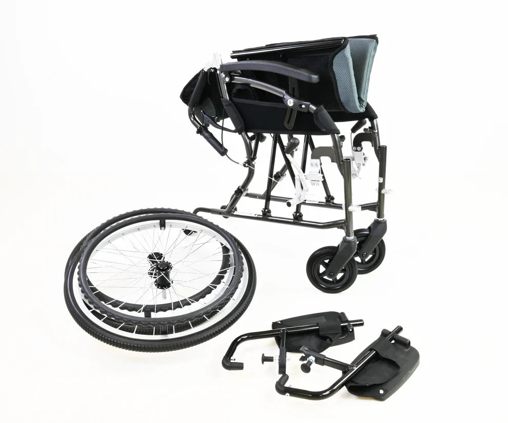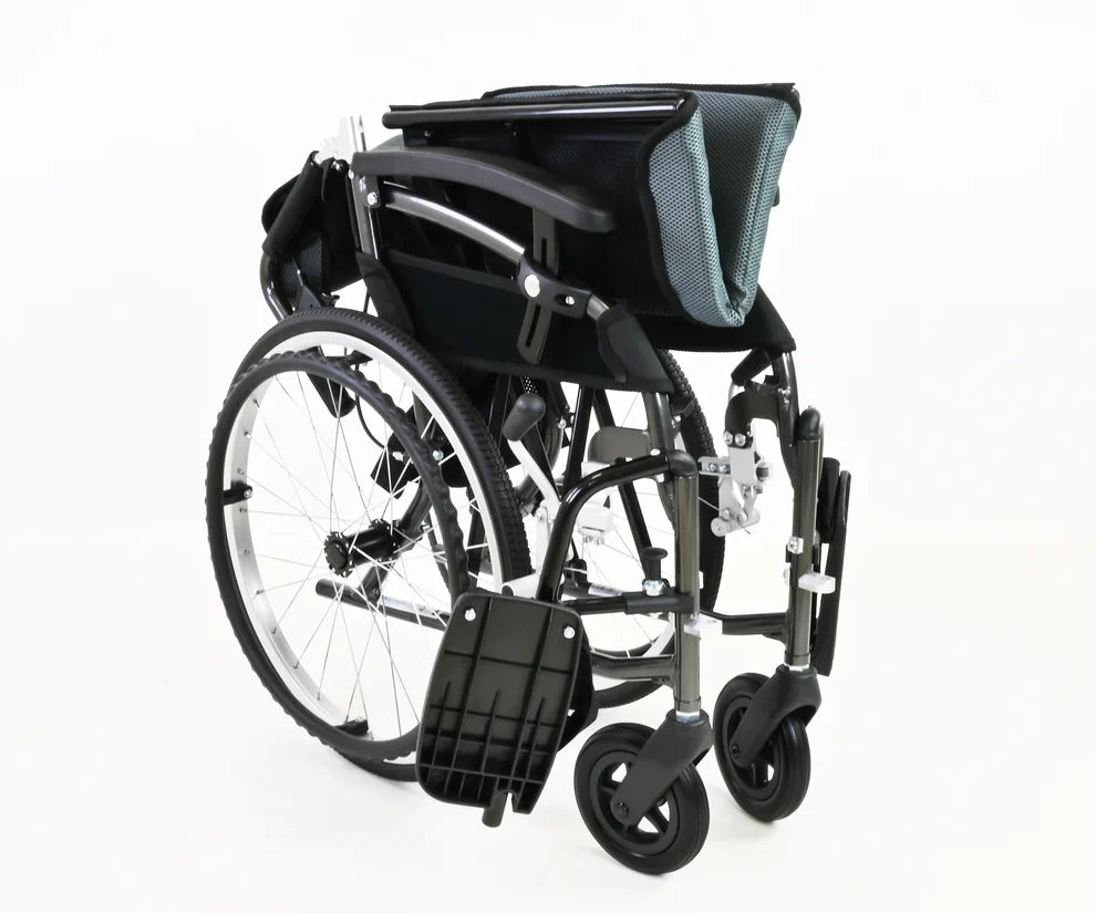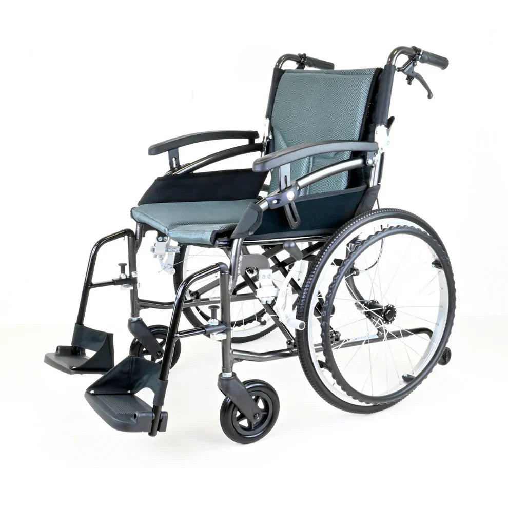 The Gravity Lite Self-Propel Wheelchair combines lightweight portability with everyday comfort and reliability. Crafted from premium aircraft-grade aluminium, this durable wheelchair weighs just 7.7kg at its heaviest point, making it ideal for travel, transport, and daily manoeuvrability. Quick-release rear wheels, swing-away footrests, and adjustable armrests ensure easy customisation, while locking attendant brakes provide added safety. Sleek, modern styling and compact design make it a practical and stylish mobility solution for home, travel, or outings.
