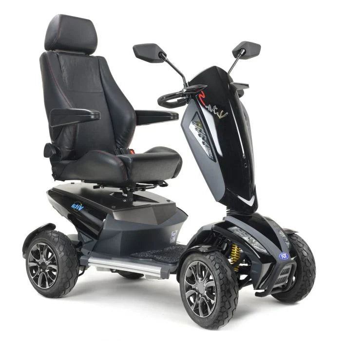 Product Specifications Top Speed 8 mph Maximum Range Up to 30 miles Maximum User Weight 25 stone Scooter Weight (incl. battery) 134 kg Overall Width 26.5″ Overall Length 60″ Overall Height 60.5″ Battery Type Lead acid Battery Size 2 x 50Ah Charging Type On-board only Tyre Type Pneumatic Wheel Size Rear: 13.3″ / Front: 12.5″ Suspension All-round Seat Type Swivel comfort seat with lumbar support Seat Width 23″ Tiller Type Delta tiller bar Ground Clearance 3.9″ Turning Radius 50″ Lighting Full LED with smoked lens covers Braking System Automatic braking Maximum Climbing Gradient 10° Warranty 3-year parts & labour warranty nationwide
