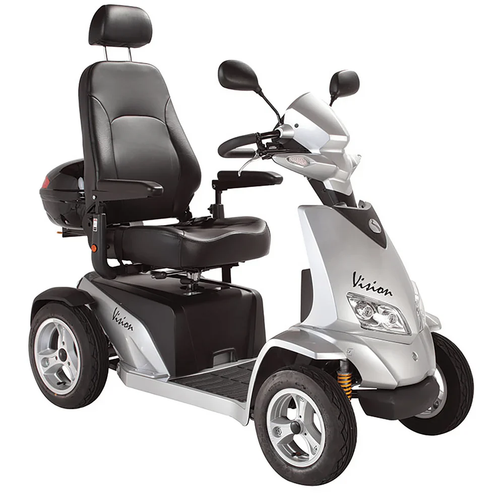 The Rascal Vision 8 mph Mobility Scooter combines stylish design, comfort, and high performance for users seeking a reliable, long-range mobility solution. This Class 3 road-legal scooter offers up to 37 miles per charge with the 100Ah battery option, making it perfect for full-day journeys. Its robust suspension, ergonomic delta tiller, and padded swivel captain seat with lumbar support ensure a smooth and comfortable ride across pavements, roads, and light off-road paths. Tiller-mounted charging and bright headlights add practicality and safety for everyday use.