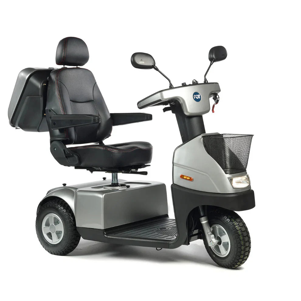Mobility Scooter Specifications Top Speed 8 mph Range 20 Miles (50 Ah) / 30 Miles (75 Ah) Maximum User Weight 21 Stone 6 lbs (137 kg) Total Product Weight 110 kg Overall Width 25" (63.5 cm) Overall Length 51" (129.5 cm) Overall Height 53" (134.6 cm) Battery Type Lead Acid Battery Size 50 Ah or 75 Ah Off Board Charging No Tyres Pneumatic Wheel Size 12.5" Suspension Full suspension Swivel Seat Yes Tiller Type Delta Tiller Bar Ground Clearance 4" (10.2 cm) Turning Radius 39" (99 cm) Head Light Yes Max Climbing Gradient 11° Seat Width 18.5" (47 cm) Warranty 3 Years Parts & Labour Warranty Nationwide