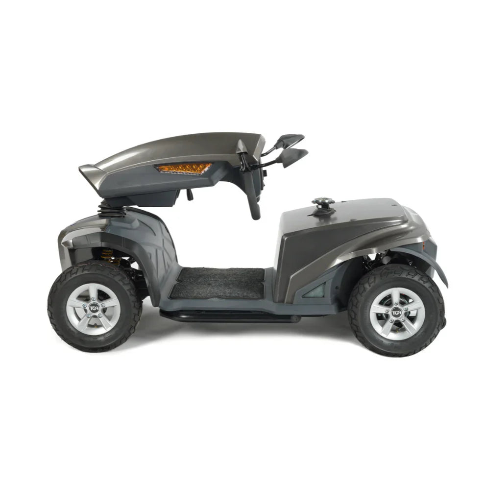 Product Specifications Top Speed 8 mph Range 25 miles Maximum User Weight 23 Stone (146 kg) Total Product Weight 117 kg Overall Width 26" (66 cm) Overall Length 53.5" (136 cm) Overall Height 54.5" (138.4 cm) Battery Type Lead Acid Battery Size 2 x 50 Ah Off Board Charging No Tyres Pneumatic Wheel Size 12.5" Suspension Full suspension Swivel Seat Yes Tiller Type Delta Ground Clearance 2.5" (6.4 cm) Headlight Yes Additional Features Ergonomic rotating seat, adjustable tiller, built-in charging ports, water bottle holder Warranty Typically 1 Year Parts & Labour