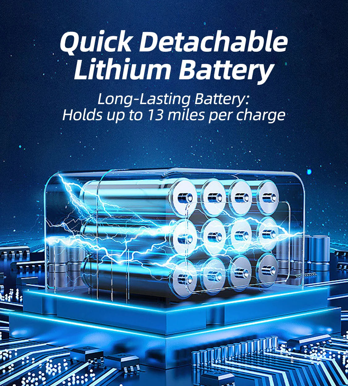 | Long Battery Range | Travel up to 30 km on a single charge with two lithium battery options – 6.6Ah or 12Ah – perfect for daily use or longer outings. |